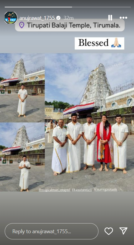 Royal Challengers Bengaluru cricketers Karn Sharma, Swapnil Singh and Anuj Rawat worshipped the Tirupati Temple in Tirumala along with other RCB staff members. Anuj Rawat uploaded the glimpses of the visit on his official Instagram story. RCB will be taking on Chennai Super Kings in their final Indian Premier League 2024 match.Ā RCB IPL 2024 Playoff Chances: Royal Challengers Bengaluru Current Position on Points Table With Net Run Rate, Matches Won and Upcoming Games