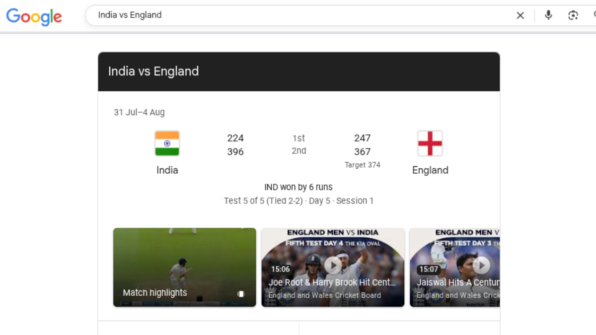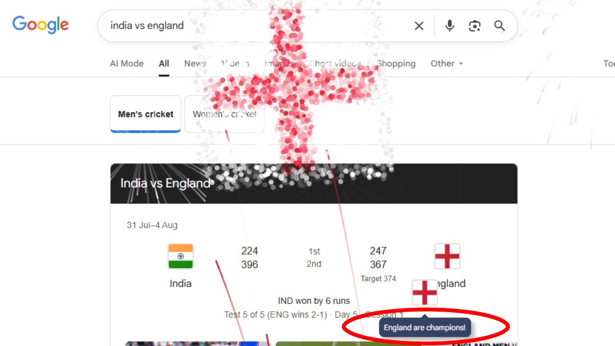 India secured a memorable victory in the fifth Test against England at the Oval. England needed only 35 runs with four wickets in hand on Day 5 and India managed to stop them six runs ahead of their target. With this win, with a young squad and a new captain, India have levelled the series 2-2. Despite that, in a bizarre manner google search fireworks animation showed that England are champions despite the series ending in a draw. Fans were surprised and they took to social media to react. Although Google later fixed the technical error. India Level Anderson-Tendulkar Trophy 2025; Prasidh Krishna, Mohammed Siraj Help Shubman Gill and Co Achieve Memorable Comeback As They Equalise Series 2-2 Following Narrow 6-Run Victory Over Hosts.