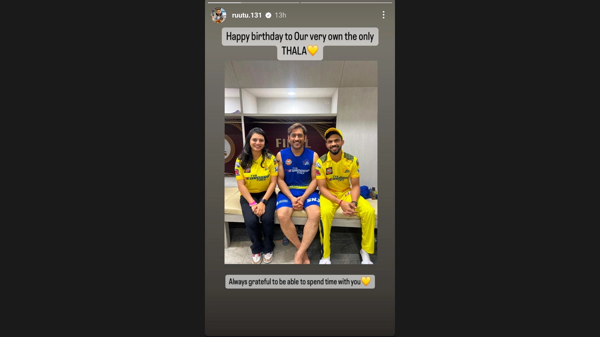 Mahendra Singh Dhoni turns 43 on July 7, 2024. The former Indian Captain celebrated his birthday with his wife Sakshi and close friends while fans and teammates wished him on social media and over calls. Chennai Super Kings Captain Ruturaj Gaikwad also wished MSD over a video call and shared the pics on his Instagram Story. Gaikwad took over CSK’s captaincy from Dhoni in the 2024 IPL Season. Both players share a special bond leading the team to the 2023 IPL title. Check out the photos shared by Ruturaj Gaikwad below. MS Dhoni Birthday Special: Thala's Obsession With Number 7 Explained As He Turns 43.