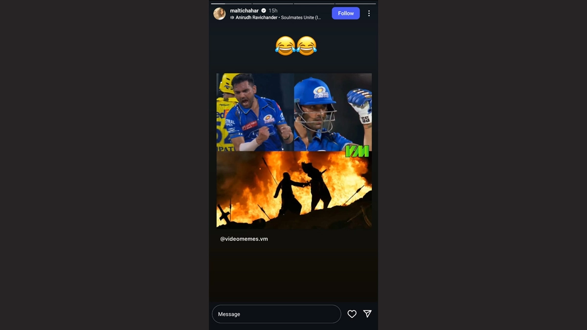 Following the four-wicket victory by Chennai Super Kings against arch-rivals Mumbai Indians, discussions and memes have flooded the internet. Now, new MI bowler Deepak Chahar's sister Malti Chahar also shared a hilarious meme on her official Instagram handle, where her brother's lone performance of 28 runs off just 15 deliveries and also a wicket against ex-team CSK in IPL 2025 has been referred with a popular scene from Indian movie "Bahubali". The meme draws reference to treachery from closed ones, in this context from Chahar to CSK, as Chahar has served CSK for a long time. MS Dhoni Jokingly Hits Deepak Chahar With the Bat After Ex-Chennai Super Kings Star's Playful Attempt at Sledging Him During CSK vs MI IPL 2025 Match (Watch Videos).