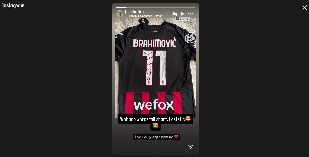 Star Indian cricketer Jasprit Bumrah shared a story on Instagram where he posted a picture of a signed AC Milan jersey by none other than Zlatan Ibrahimovic. In the caption Bumrah mentioned, 'Wohoo, words fall short. Ecstatic'. He also thanked his wife Sanjana Ganesan in the caption which indicated that his better half had a role to play in him getting the signed jersey. Zlatan Ibrahimovic is a star footballer who has played for clubs like AC Milan, Barcelona and Manchester United. The Swedish star was also known for scoring acrobatic and miraculous goals. Navdeep Saini Hails Indian Pacer Jasprit Bumrah’s Form in Anderson-Tendulkar Trophy 2025, Stresses Importance of Domestic Cricket.