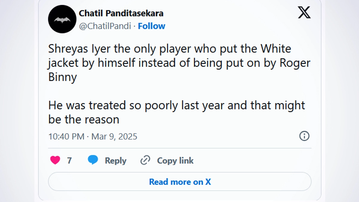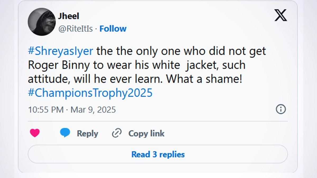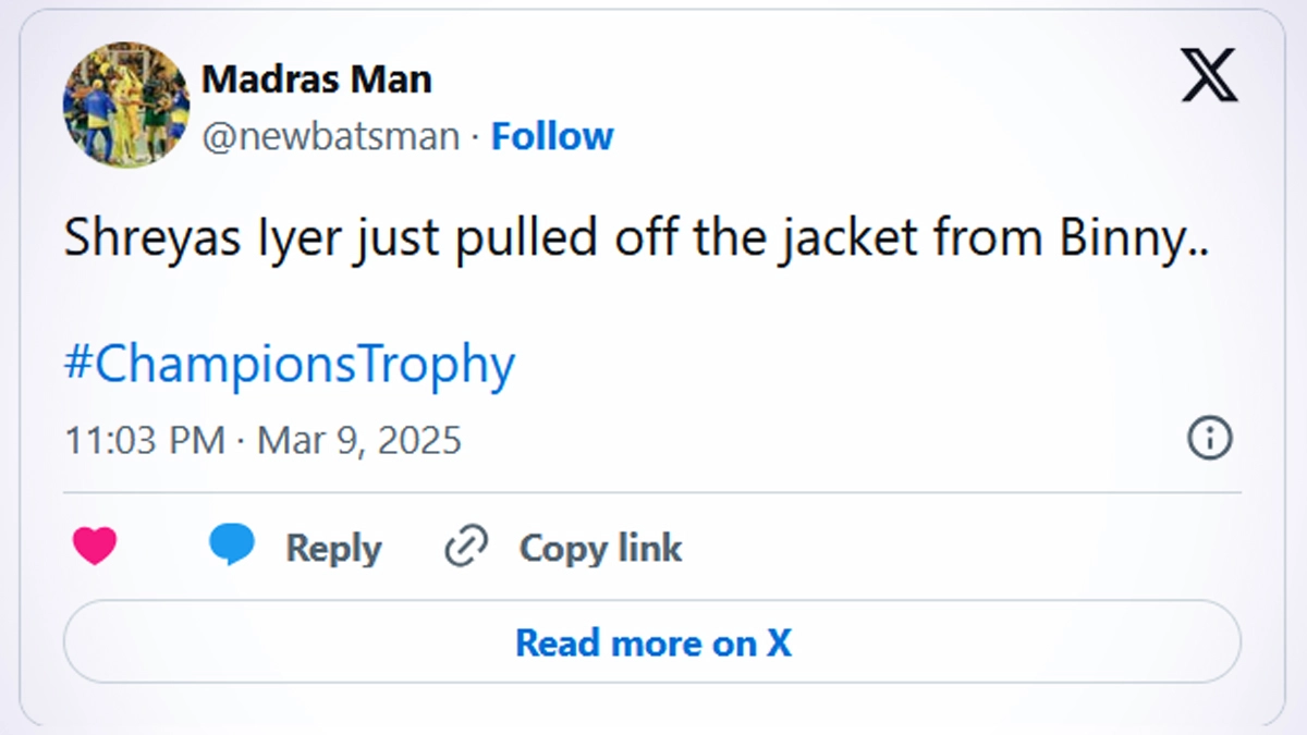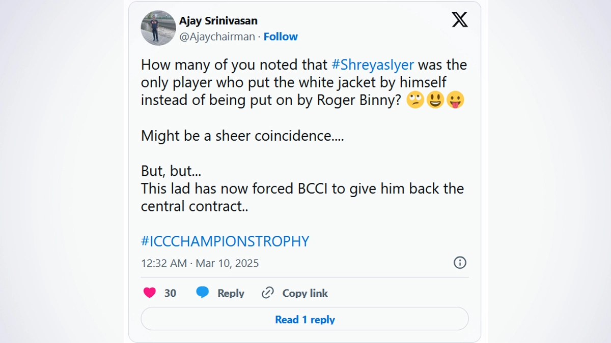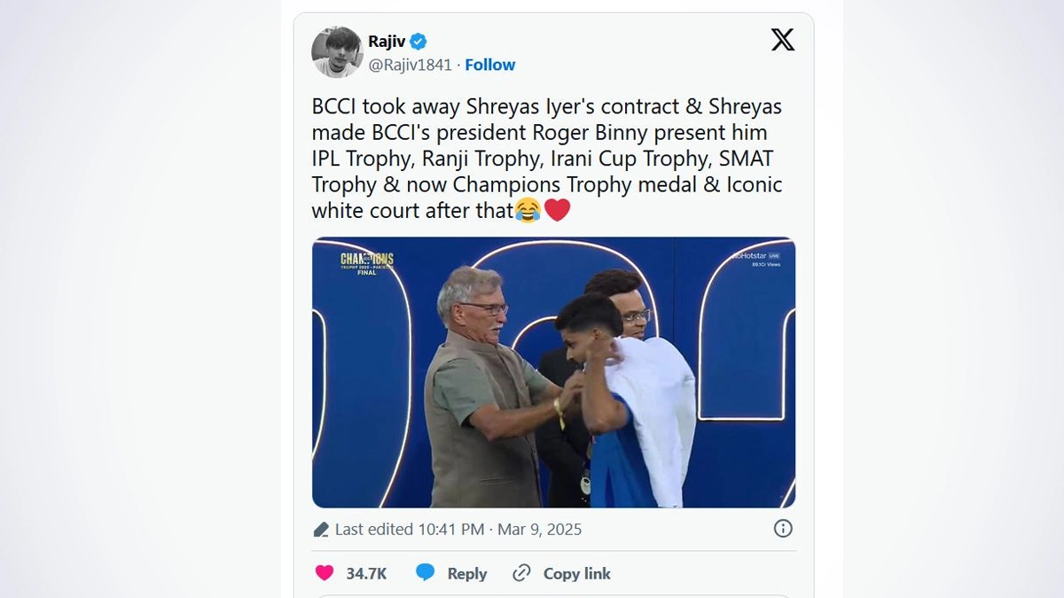 Fans have claimed that Shreyas Iyer declined BCCI (Board of Control for Cricket in India) president Roger Binny's gesture of putting the ICC Champions Trophy 2025 winners' jacket on him during the presentation ceremony on March 9. Shreyas Iyer played a crucial 48-run knock as India went on to beat New Zealand and win the ICC Champions Trophy 2025 title in Dubai. The players were presented with their iconic white jackets after the match as is the custom for every Champions Trophy and the BCCI chief was helping each player wear them. However, Roger Binny tried to do the same with Shreyas Iyer as well who collected his jacket and walked off, wearing it after joining his teammates. Fans felt that the player did not allow the BCCI president to put on the jacket on him. It has to be kept in mind that Shreyas Iyer's BCCI central contract was terminated last year and fans saw this in that light. Why Are White Jackets Presented to ICC Champions Trophy Winners? Check Reason.