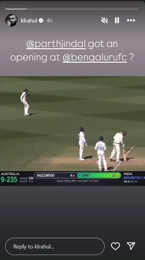 India national cricket team batter KL Rahul cheekily expressed his interest in playing for the Indian Super League (ISL) club, Bengaluru FC, which is co-owned by Delhi Capitals (DC) co-owner Parth Jindal (JSW Group). The senior cricketer shared a clip on his Instagram story where he showcased his football skills during the first Test against Australia at the Optus Stadium in Perth. In reply, Bengaluru FC took to their social media handle 'X' (formerly Twitter), where they appreciate Rahul's football skills. However, the club cheekily asked the Indian cricketer if he would consider a loan move or not. The light-hearted moment between Rahul and Bengaluru FC has been going viral on social media. Indian Cricketer KL Rahul Showcases His Football Skills With Cricket Ball During IND vs AUS 1st Test Day 4 (Watch Video).