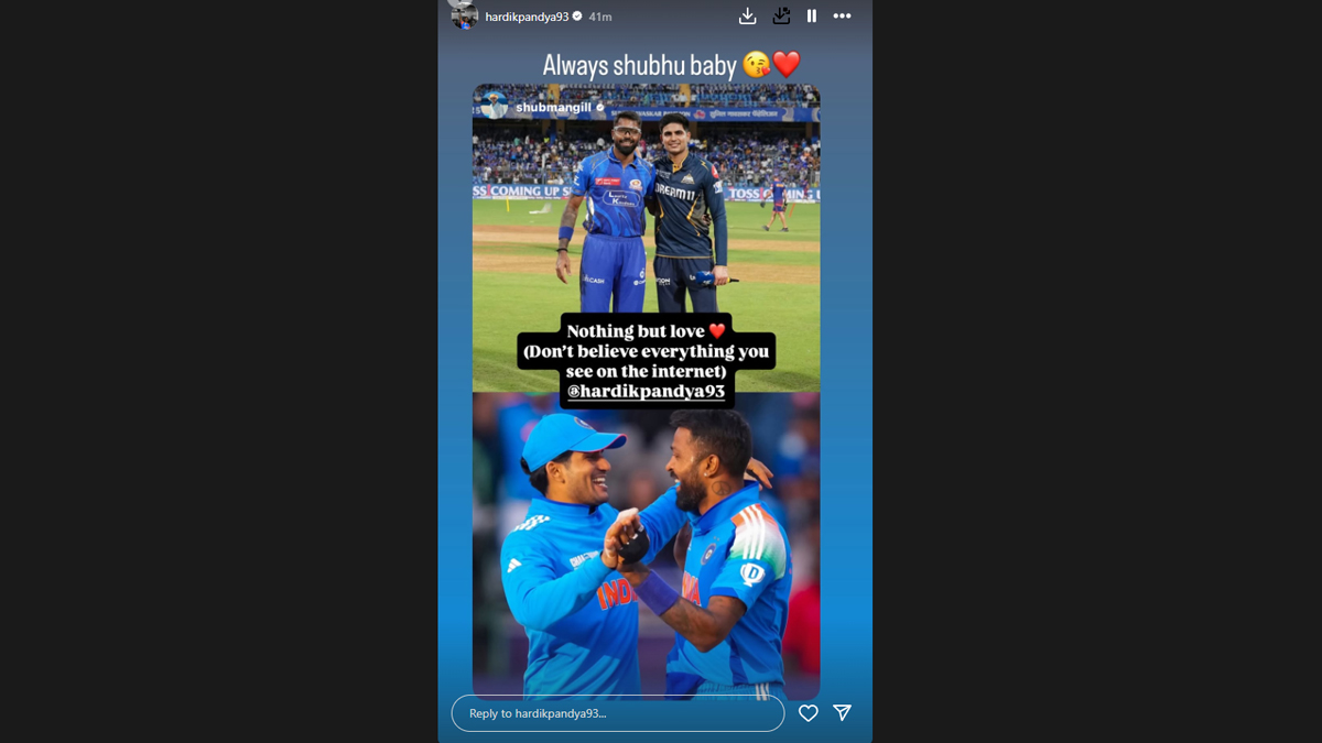 After Gujarat Titans captain Shubman Gill posted a heartwarming Instagram story, dismissing rumours about a rift with Mumbai Indians captain Hardik Pandya, the latter also shared the same post, assuring no trouble, but only 'love'. Several reports and fans on the internet claimed that Shubman Gill didn't shake hands with Hardik Pandya during the GT vs MI IPL 2025 Eliminator match coin toss, raising speculations of bitterness in the relationship between the two India national cricket team players. But Shubman Gill erased these rumours, with a post of pictures with Hardik Pandya, with the caption, "Nothing but love, Don't believe everything you see on the Internet." Hardik Pandya has now reshared Shubman Gill's story, writing "Always shubu baby". โDonโt Believe Everything You See on Internetโ Shubman Gill Ends Speculations of Him Ignoring Handshake With Hardik Pandya at Toss During GT vs MI IPL 2025 Eliminator (See Post).