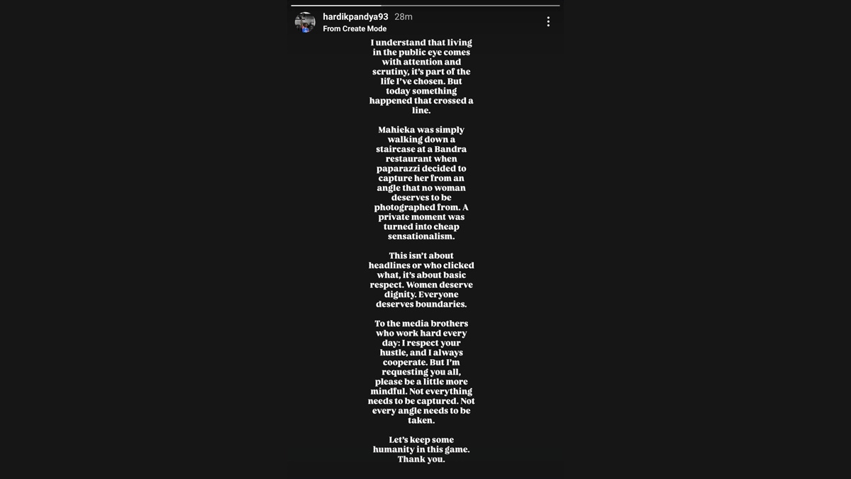 In India, the paparazzi culture is slowly becoming a menace, with celebrities rarely having a private moment, as cameras hound them from every possible angle. Indian cricketer Hardik Pandya has hit out at the paparazzi, who clicked rumoured girlfriend Maheika Sharma's videos and photographs taken outside a Bandra restaurant in Mumbai, where the paps filmed the model at a rather uncultured angle, which irked the star all-rounder. Pandya took to Instagram, urging media personnel to be more mindful and not turn a 'private moment into cheap sensationalism'. The Indian star player stated that getting papped is a part of social life, but asked the media to show respect and maintain boundaries. Fact Check: Did Hardik Pandya, His Rumoured Girlfriend Mahieka Sharma and Son Agastya Pose Together? Here’s the Truth Behind Viral Pic.