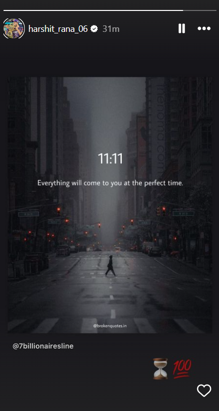 Kolkata Knight Riders pacer Harshit Rana posted a cryptic post on his Instagram story after missing out from India's T20I squad for the upcoming T20I series against Zimbabwe. Shubman Gill will be leading the 15-member squad in the IND vs ZIM T20I series which is set to take place after the T20 World Cup 2024. Rana was the go-to bowler for KKR in the Indian Premier League 2024 and helped them win the title with his match-winning performances. Rana reposted a motivational post which read, 'Everything will come to you at a perfect time.' Dan Lawrence Smashes Shoaib Bashir for 38 Runs in One Over During Surrey vs Worcestershire County Championships 2024 Match (Watch Video).