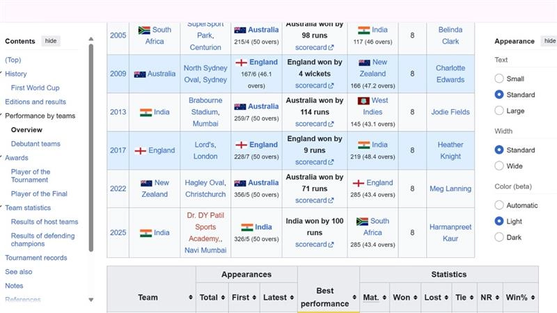 The Internet can be a great source of information. However, with time, Wikipedia, which has one of the leading sites of knowledge for users, has dished out wrong information, which was seen on its ICC Women's World Cup 2025, where the tournament history table showcased India as victors, having beaten South Africa by 100 runs. Interestingly, the India Women vs South Africa Women ICC Women's WC 2025 Final is due on November 2 in Navi Mumbai, and a fan already edited the result table for the ICC Women's World Cup 2025 Final. It must be pointed out that any user can edit a table, add/delete information on a Wikipedia page by virtue of creating an account. Users are notorious for adding misinformation on Wikipedia, where information remains largely unchecked or verified. Virat Kohli Lauds India Women’s Cricket Team Heroics in ICC Women’s World Cup 2025 Semifinal Against Australia, Says ‘True Display of Belief and Passion’ (See Post).