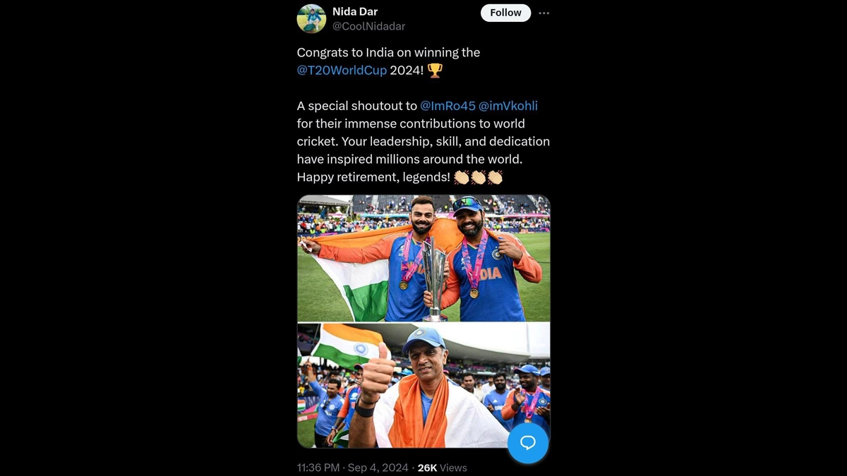 Nida Dar Congratulates India for Winning T20 World Cup 2024