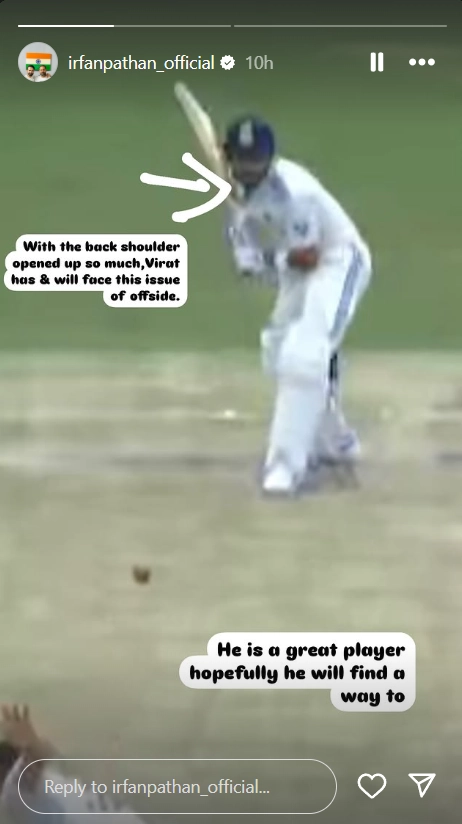 Former all-rounder Irfan Pathan pointed out a major flaw in India national cricket team ace batter Virat Kohli's technique while facing the outside off-stump deliveries during the Border-Gavaskar Trophy 2024-25. Irfan Pathan shared a story on his Instagram where he pointed out Kohli's back shoulder was dropping towards the off-side. After scoring a crucial century in the opening Test, Kohli has once again failed to score runs against the off-side deliveries from the Australian seamers. The great batter was dismissed similarly in the second Test in Adelaide and the first innings of the third Test in Brisbane. Virat Kohli Wicket Video: Watch Josh Hazlewood Dismiss Star India Batter During IND vs AUS BGT 2024–25 3rd Test.