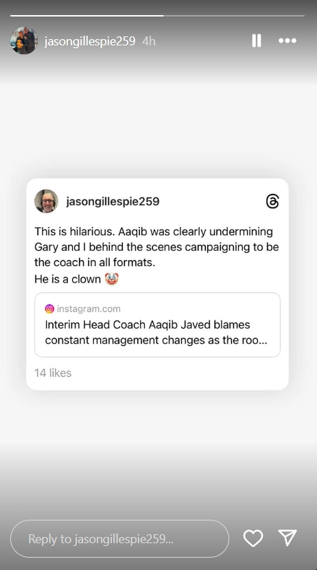 Former Pakistan head coach Jason Gillespie lashed out at Green Shirt's current interim coach Aaqib Javed. The former Pakistan coach labelled Aaib Javed a 'clown.' Gillespie's remark came after Aaqib Javed cited the Pakistan men's team's struggles due to the frequent changes in their coaching and management during a press conference. In an Instagram story, Jason Gillespie alleged that Javed had attempted to undermine former Pakistan head coach Gary Kirsten and him. It is to be noted that both Jason and Kirsten resigned from their coaching positions within a year of their appointments, citing disagreements with Pakistan Cricket Board (PCB) officials. Recently, host Pakistan was knocked out of the ICC Champions Trophy 2025 tournament. Aaqib Javed Set To Continue As Pakistan Cricket Team’s Head Coach for Tour of New Zealand After ICC Champions Trophy 2025 Flop Show.