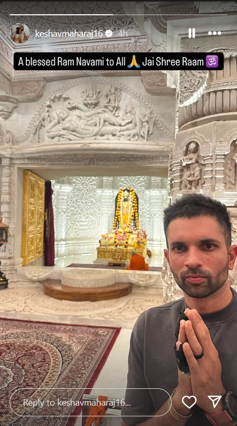 Veteran South Africa national cricket team player Keshav Maharaj wished everyone "Happy Ram Navami" on the auspicious day of Ram Navami, a holy festival celebrated by the Hindu religion, mainly in India. Maharaj shared a story on his Instagram where he wished his fans on the holy day. The left-arm spinner uploaded a pic of the holy Ram Mandir in Ayodhya, which he visited in 2024. David Warner Extends Ram Navami 2025 Wishes to Fans, Former Australia Cricketer Writes ‘May the Blessing of Lord Ram Bring Peace and Harmony ..’ (See Post).