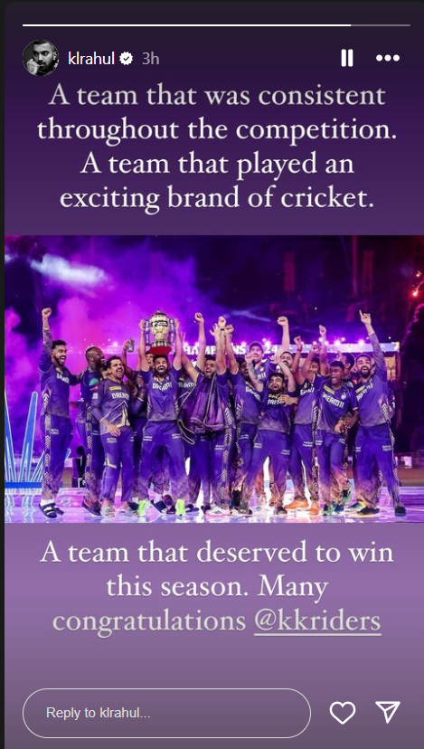 KL Rahul's Instagram story for KKR and he congratulating KKR team to winning IPL 2024. ❤️ pic.twitter.com/RkmoWlIaIP