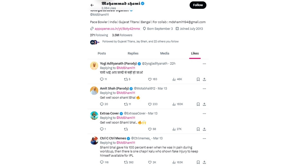 Mohammed Shami made the news after he 'liked' a tweet from a fan that criticised a player who faked an injury to be fit for the IPL.Ā On March 13, the Gujarat Titans' pacer took to social media to share an update where he stated that he had his stitches removed from his heel after 15 days of surgery. A fan with the username 'Ctrlmemes_' responded to that post and wrote, "Shami bhai gave his 100 percent even when he was in pain during worldcup, then there is one chapri kalu who shown fake injury to keep himself available for IPL." While fans have stated that thisĀ commentĀ was directed at Hardik Pandya, others were surprised to find out that Shami liked this tweet, stating that he must not have read the whole thing. Fans have reacted after spotting Shami's 'like' on that response by the fan.Ā Mohammed Shami Falls for Parody Accounts of Amit Shah and Yogi Adityanath? Fans Share Images Claiming Pacerās Replies.