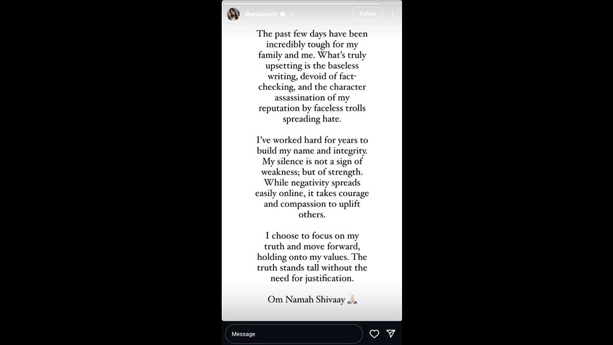 Being a celebrity in India is not an easy task. Choreographer and social media influencer Dhanashree Verma, who is married to Indian ace spinner Yuzvendra Chahal, has been facing quite a barrage of hate comments, and toxicity over the past few days following rumours about the divorce with her husband gained momentum. Dhanashree took to Instagram and lashed out at 'faceless trolls' while stating how baselessly her name and stature are being questioned. The 28-year-old asserted that she will keep on moving forward, and that truth never needs justification. 'Silence is A Profound Melody...' Yuzvendra Chahal Shares Cryptic Instagram Story Amid Divorce Rumours With His Wife Dhanashree Verma.