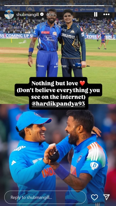 Shubman Gill has put to rest rumours about ignoring the handshake offer from Hardik Pandya at the coin toss during the GT vs MI IPL 2025 Eliminator match. The Gujarat Titans skipper shared a heartwarming Instagram story with Hardik Pandya where he wrote, "Nothing but love, Don't believe everything you see on the Internet." During the IPL 2025 Eliminator clash in Mullanpur, both cricketers were involved in an incident during the coin toss, which caught the attention of fans. At the toss, Gill appeared to ignore a handshake offer from Hardik, which fans quickly spotted and began speculating on, a potential rift between the cricketers. With Gill sharing an Instagram story, all rumours have come to an end. Fans Allege Shubman Gill Ignored Hardik Pandya’s Handshake Offer at Coin Toss During GT vs MI IPL 2025 Eliminator Match in Mullanpur (Watch Video).