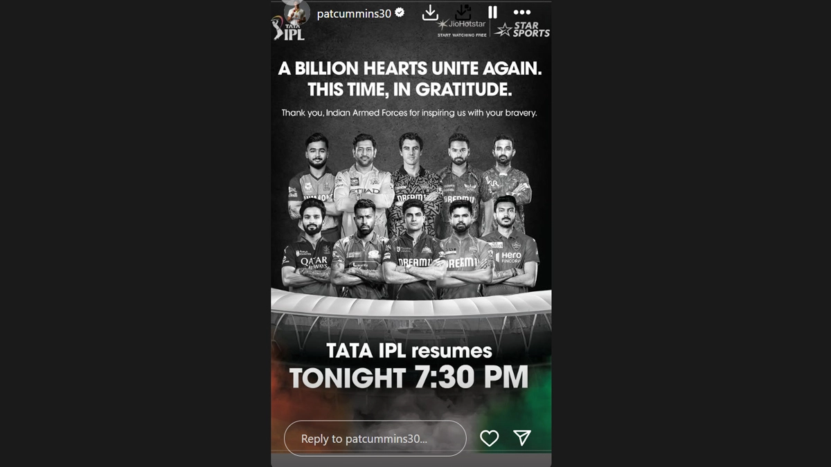 Star Australia national cricket team player and Sunrisers Hyderabad captain Pat Cummins has thanked the Indian Armed Forces through his Instagram story, as the Indian Premier League 2025 is set to resume again after a halt amid rising India Pakistan tension following the aftermaths of the Pahalgam terror attack. In the story posted by Pat Cummins, it was written, "A billion hearts unite again. This time, in gratitude". In the post from Pat Cummins, it was also written, "Thank you, Indian Armed Forces for inspiring us with your bravery". The IPL 2025 is set to resume from May 17. Rahul Dravid Congratulates Hitman As Rohit Sharma Stand Gets Unveiled At Wankhede Stadium In Mumbai, Says 'When I Am Short Of Tickets In Mumbai... I Know Who To Contact' (Watch Video).