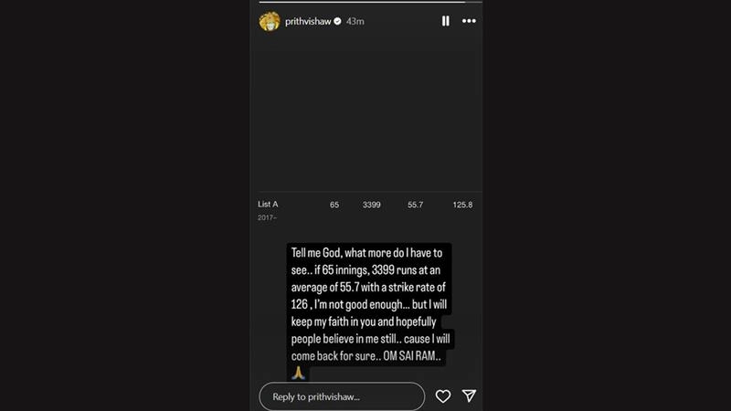 Prithvi Shaw Expresses Disappointment Through Instagram Story