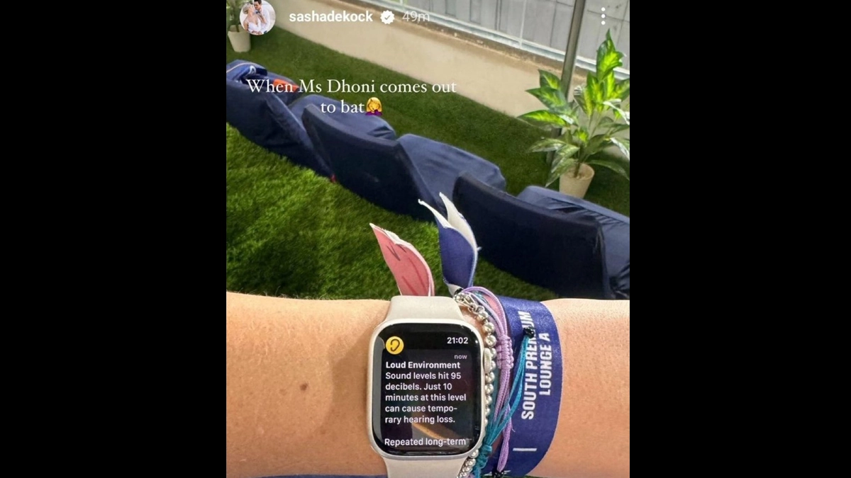 Ever wondered what the decibel levels are like when MS Dhoni walks out to bat? Well, you could not have had a better example than this! The 42-year-old walked out to a rousing reception at the Ekana Cricket Stadium during the LSG vs CSK match and such was the noise made by the fans that Quinton de Kock's wife Sasha's smartwatch sent a noise alert notification! In an Instagram story, Sasha shared a picture of her smartwatch, which had the alert that read, "Loud Environment. Sound levels hit 95 decibels. Just 10 minutes at this level can cause temporary hearing loss." She shared the pic and wrote, "When Ms Dhoni comes out to bat." MS Dhoni Receives Rousing Reception From Fans As He Walks Out to Bat at Ekana Cricket Stadium During LSG vs CSK IPL 2024 Match, Video Goes Viral.