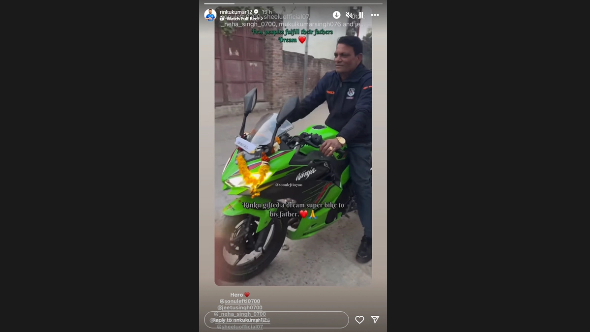Rinku Singh gifted his father Khanchandra Singh a Kawasaki Ninja bike. In a video that went viral on Instagram, the India national cricket team and Kolkata Knight Riders (KKR) star's father was seen enjoying a ride on the brand new bike in a locality. Rinku Singh shared the video on his Instagram story and wrote, "Hero". A couple of days ago, a video had gone viral of Rinku Singh distributing money to waiters at an event. The 27-year-old was also rumoured to have been engaged to Samajwadi Party MP Priya Saroj in recent times. Indian Cricket Team Star Rinku Singh Gets Engaged to Samajwadi Party MP Priya Saroj? Here’s What We Know.