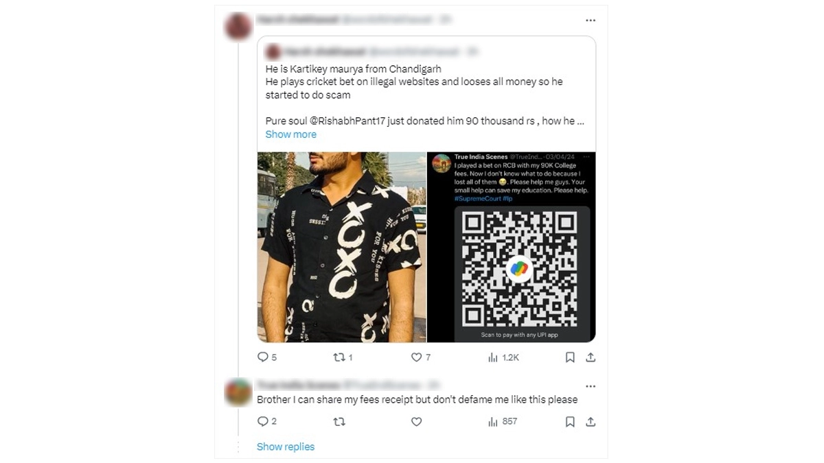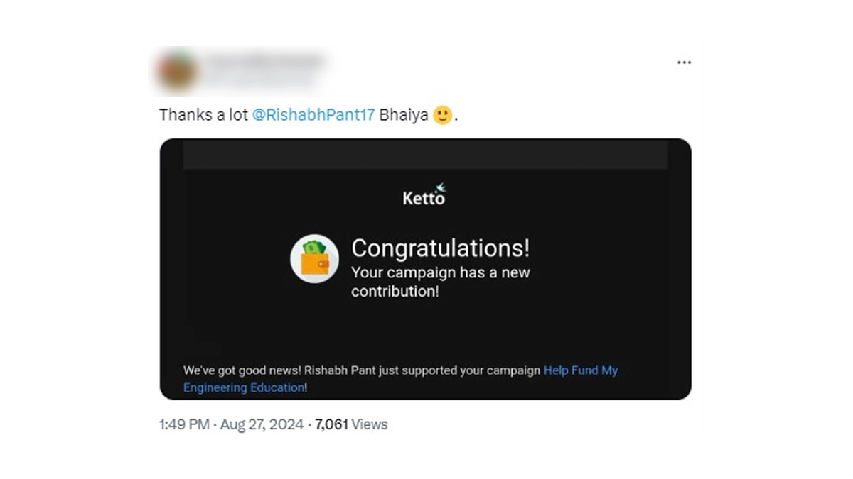 Did Rishabh Pant donate a massive sum of Rs 90,000 to a student for his education? Well, a user on 'X', formerly Twitter, has made this massive claim and also thanked the star cricketer for his help. In a post on the micro-blogging platform, the user with the handle 'TrueIndScenes' had shared a link to a fundraiser where he claimed to be a student, struggling to fund his engineering education. He tagged the Indian wicketkeeper-batter and asked for his help. Rishabh Pant obliged and helped him financially. However, another user on the platform called him a scammer, claiming his actual name is Kartikey Maurya and that he makes cricket bets on illegal websites and loses money there. The 'X' user subsequently offered to refund the money he received from Rishabh Pant and posted an update, stating that he has initiated the process of doing so. Rishabh Pant Replicates Star Actor Rajinikanth's 'Thalaiva' Look, Stylish Picture of Indian Wicketkeeper-Batsman Goes Viral.