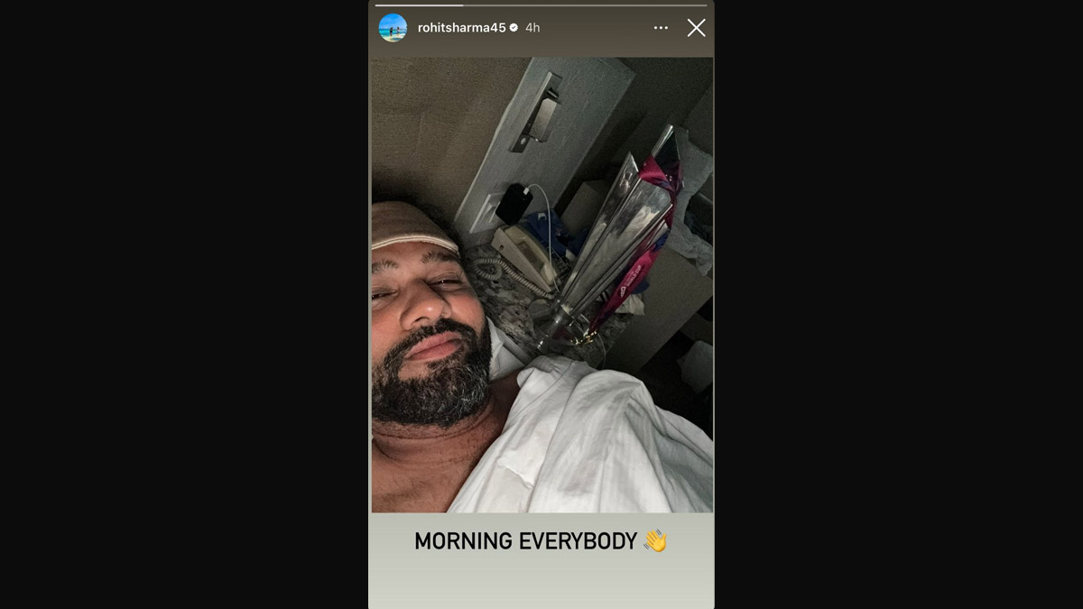 Rohit Sharma led India to the ICC T20 World Cup 2024 victory and broke the ICC trophy draught for India. After captaining India in three ICC tournaments, Rohit has finally won one which is the first ICC title for India in last 11 years and the first T20 World Cup in last 17 years. The mood of celebration has just started within the Indian camp and to spark it up a little Rohit Sharma shared an Instagram story from his bed with the trophy beside him and the caption 'Morning Everybody'. Fans loved the story and made it viral on social media. ICC T20 World Cup 2024: Rohit Sharma Believes Rahul Dravid 'Deserved the Trophy' for His Contribution to Indian Cricket.