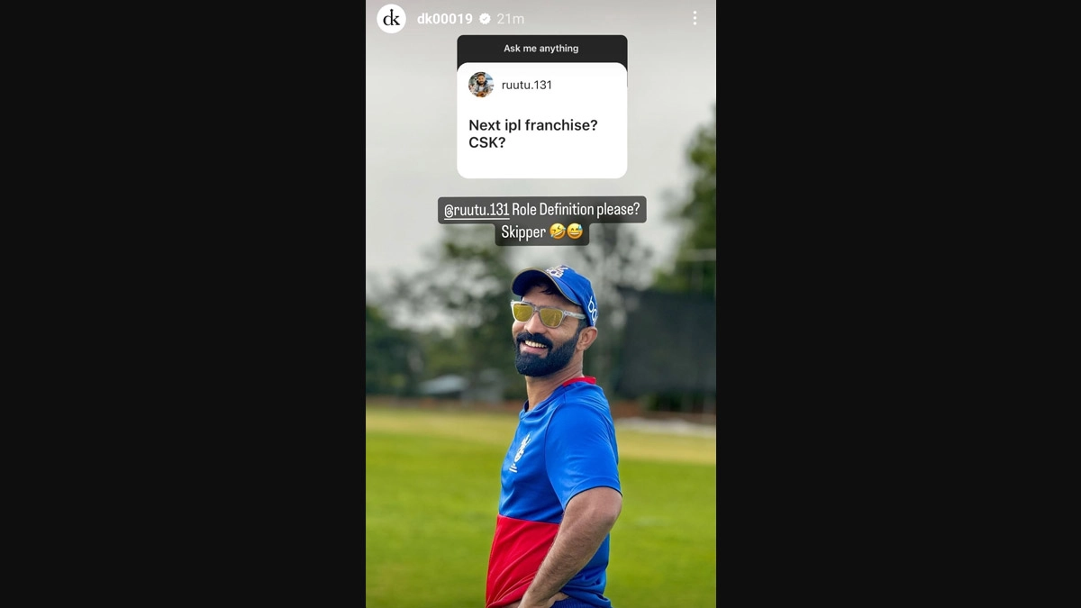 Ruturaj Gaikwad dropped an epic response to Dinesh Karthik who conducted a Q&A on his Instagram. The CSK captain came forward with a query where he wrote, "Next IPL franchise? CSK' to Karthik's Instagram session and the RCB wicketkeeper-batter, in response, wrote, "Role Definition please? Skipper" followed by a couple of emojis. Notably, it was reported that Karthik will be retiring from the IPL after the 2024 season. The 38-year-old has been in fine form in IPL 2024 with the bat, scoring 301 runs in 13 matches with a top-score of 83 runs. MS Dhoni Visits Royal Challengers Bengaluru Dressing Room Ahead of Crucial RCB vs CSK IPL 2024 Match, Served a Cup of Tea by Support Staff (Watch Video).