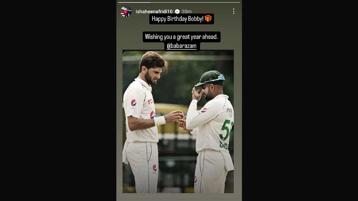 Shaheen Shah Afridi wished Babar Azam on his 30th birthday. The Pakistan cricket team pacer took to Instagram to share a story featuring a picture of him and Babar Azam. He wrote, "Happy Birthday Bobby! Wishing you a great year ahead." Both Shaheen Afridi and Babar Azam were part of Pakistan's defeat to England in the first Test and subsequently did not find a place in the team for the remaining two Test matches. A massive number of fans took to social media to share birthday wishes for the former Pakistan captain as he turned 30. Babar Azam Birthday Special: Three Factors Which Led to Star Batsman’s Ouster from Pakistan Test Squad.