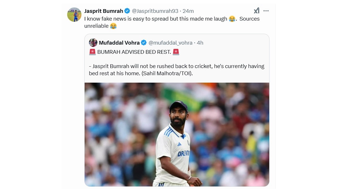 Jasprit Bumrah suffered a back injury during the India vs Australia Border-Gavaskar Trophy 2024-25 Sydney Test match. He didn't bowl in the second innings and the extent of his injury was yet to be confirmed. There has been recent reports that Bumrah had a back swelling and he has been advised to take bed rest which makes him uncertain for the ICC Champions Trophy 2025. In response, Bumrah shared a post on social media, where he quoted the report posted by an X user with the caption, 'I know fake news is easy to spread but this made me laugh 😂. Sources unreliable'. Jasprit Bumrah Advised Bed Rest Due to Back Swelling, Star Indian Pacer's Participation in ICC Champions Trophy 2025 Remains Uncertain: Report.