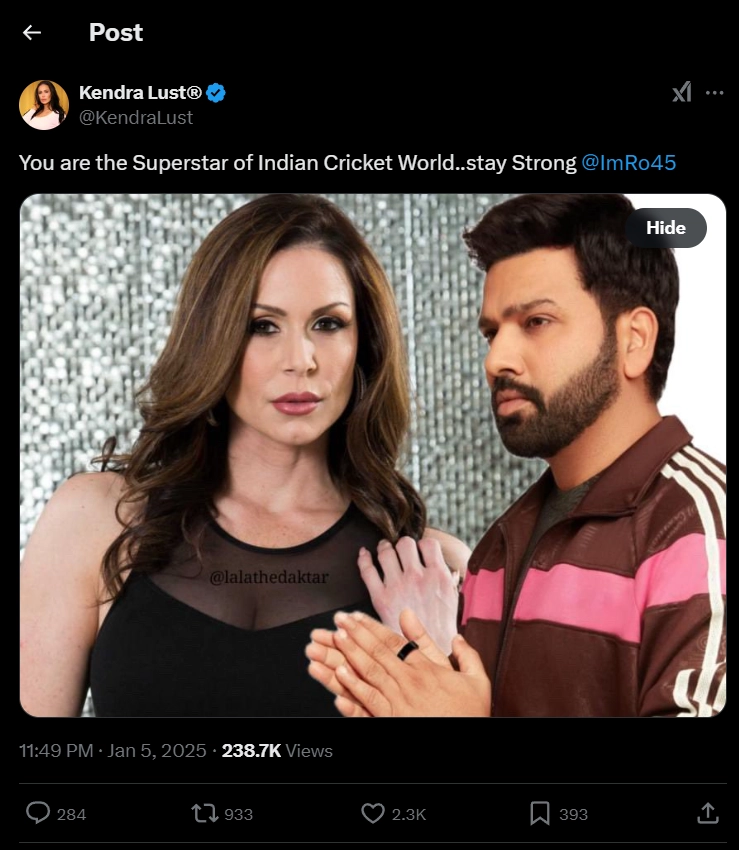 Famous pornstar Kendra Lust supported India Test and ODI captain Rohit Sharma after his poor show at the Border-Gavaskar Trophy 2024-25 against the Australia national cricket team. Kendra Lust took to her 'X' (formerly Twitter), where she uploaded a morphed image of her with the India Test and ODI captain. "You are the Superstar of Indian Cricket World..stay Strong @ImRo45," the famous pornstar captioned the post. Veteran cricketer Rohit Sharma had a dismal run with the bat during the Australia tour. In three Tests, Sharma amassed 31 runs at a poor average of 6.20. Rohit also 'opted out' of the fifth Test in Sydney, which India lost by six wickets. The veteran also missed the first Test in Perth due to personal reasons. Rohit Sharma and Virat Kohli to Play, Jasprit Bumrah to be Rested In IND vs ENG ODI Series 2025; Provisional Squad For ICC Champions Trophy 2025 to be Announced Ahead of January 12: Report.
