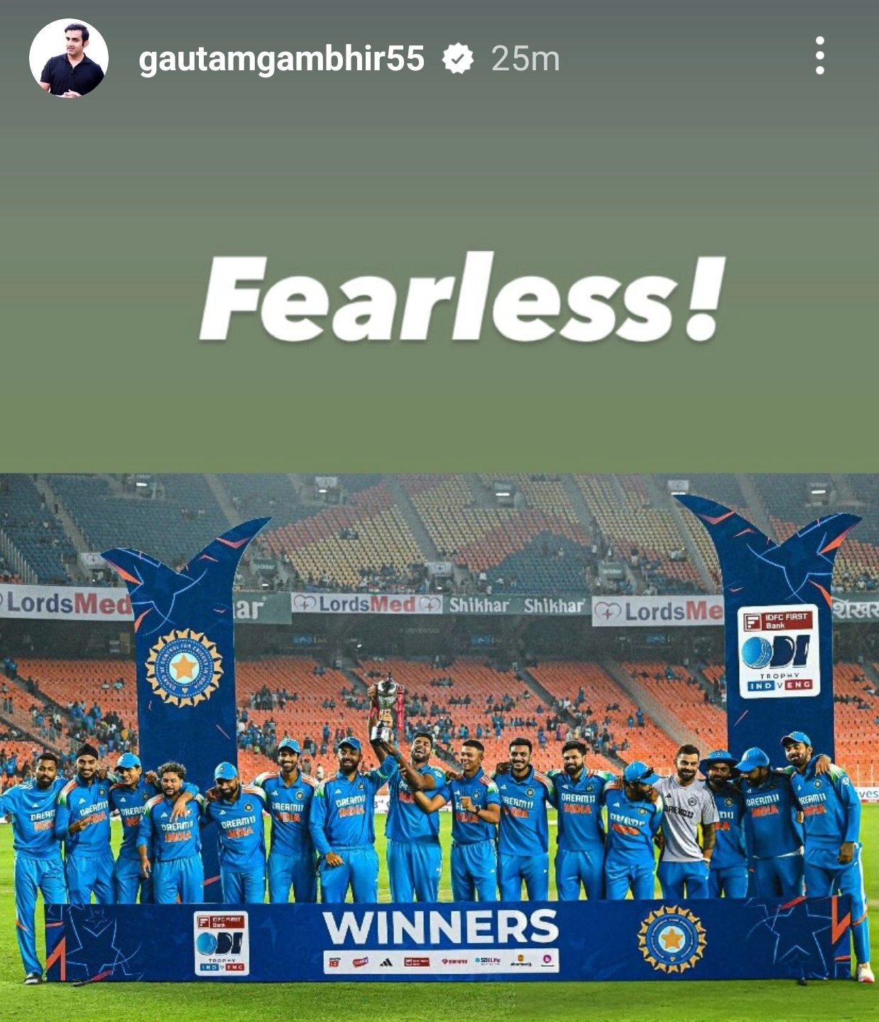 Team India head coach Gautam Gambhir shared a story on Instagram after India National Cricket Team's 3-0 whitewash over England. India secured a dominant 142-run victory over England in the 3rd ODI on Wednesday and with it completed the whitewash. Gambhir shared the picture of the team celebrating alongside the trophy with the caption of 'fearless' alongside. Fans loved it and the story went viral on social media. India Beat England by 142 Runs in IND vs ENG 3rd ODI 2025; Shubman Gill, Bowlers Shine as Men in Blue Whitewash Three Lions 3-0.