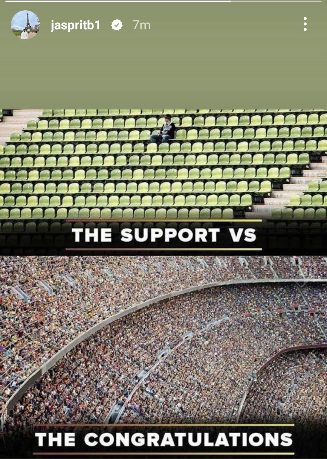 Jasprit Bumrah has claimed the no 1 spot for bowlers in the ICC Test rankings after his match-winning spell against England in the 2nd Test at Visakhapatnam. Bumrah missed one and a half year of cricket before returning to action from injury and since then he has been in great form chipping in regular wickets and wining matches for his team. As he gets flooded with congratulations from fans and well-wishers, he shared a story on Instagram with a 'Support vs Congratulations' picture. Although the real reason behind the story remains unknown, Bumrah might be indicating at the criticism and allegations of prioritizing IPL over International cricket he received during his injury period. Jasprit Bumrah Becomes First-Ever Indian Pacer to Attain Number One Position in ICC Test Rankings.