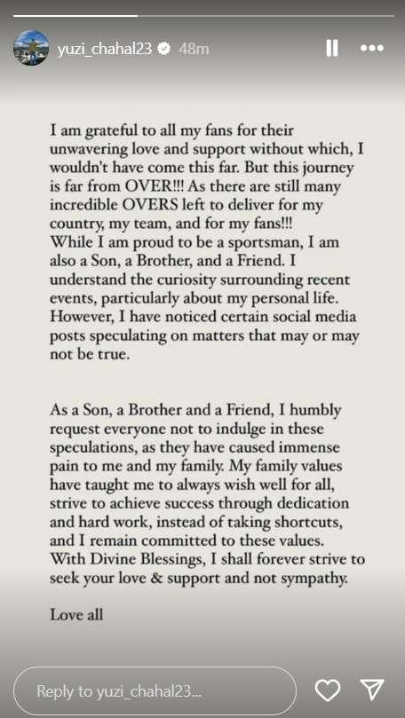 Star India national cricket team leg spinner Yuzvendra Chahal has uploaded another cryptic Instagram story on his handle amid ongoing divorce speculation with choreographer-actor Dhanashree Verma. The rumours of the couple getting separated sparked fire after the veteran Indian cricketer deleted all photos featuring Dhanashree Verma from his Instagram handle. Sources close to the couple have suggested that both have been living separately for quite some time now. However, there is no concrete reason behind it, and it remains undisclosed. Chahal and Dhanashree have also unfollowed each other on Instagram. The couple got married in December 2020 in Gurugram. Manish Pandey and Wife Ashrita Shetty Headed for Divorce? Indian Cricketer's Separation Rumours Pick Pace After Couple Unfollow Each Other on Instagram.