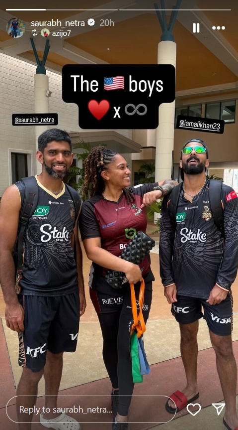 United States of America (USA) speedster Saurabh Netravalkar was spotted in the Trinbago Knight Riders (TKR) training jersey amid the ongoing Caribbean Premier League (CPL) 2025 tournament. The USA speedster shared a story on his Instagram handle along with Ali Khan, who also plays for the USA. Meanwhile, TKR is having a brilliant run in the ongoing CPL 2025 season. Trinbago Knight Riders are ranked second in the points table with 12 points to their name. They have won six matches out of the nine they have played till now. Trinbago Knight Riders Beat Guyana Amazon Warriors by Six Wickets in CPL 2025-26; Alex Hales, Colin Munro Shine As TKR Claim Top Spot in Standings.