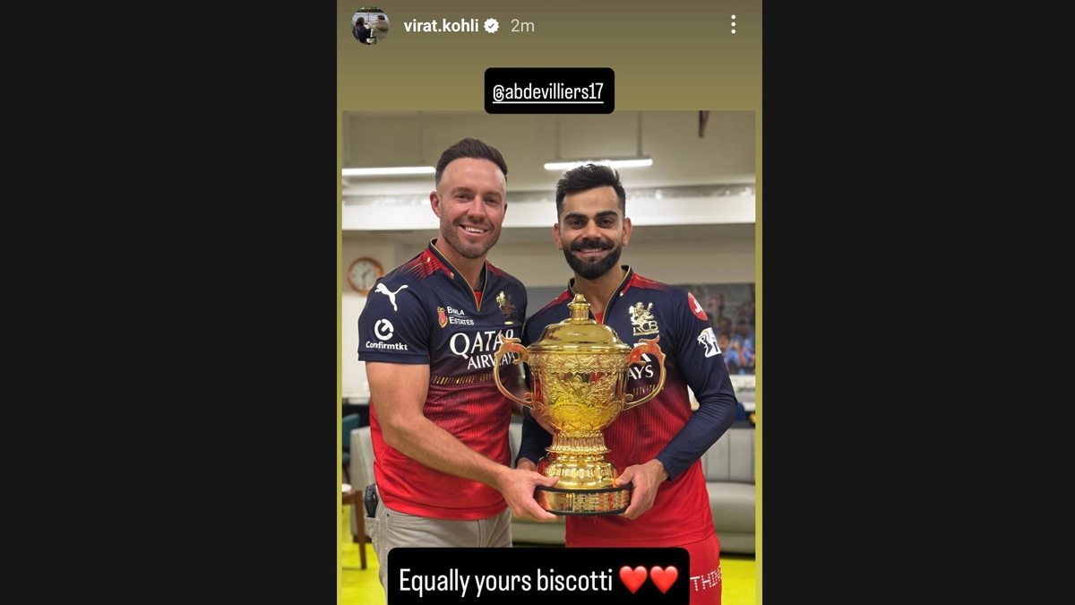 Royal Challengers Bengaluru star batter and icon Virat Kohli posted a picture of himself with former legend AB de Villiers on his Instagram story, holding the Indian Premier League trophy together. Virat Kohli posted the picture and wrote "Equally yours biscotti", indicating that RCB's maiden IPL 2025 trophy is equally claimed by AB de Villiers, who played from 2011 to 2021 with the Royal Challengers Bengaluru side. The South African legend AB de Villiers played multiple finals with the RCB side during his time, but was unfortunate, losing all. Virat Kohli shows sheer respect for AB de Villiers. Virat Kohli Jokingly Tells Phil Salt to 'Get Ready for Changing Diapers' After RCB Clinches IPL 2025 Title, Referring to England Batter’s Newborn (See Post).