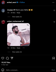 A section of Virat Kohli's fans were confused on social media after they rushed to comment on Gujarat Titans (GT) star bowler Arshad Khan's Instagram handle following the dismissal of Royal Challengers Bengaluru (RCB) opener in the Indian Premier League (IPL) 2025 match in Bengaluru. However, Kohli fans went to the wrong account, and Bollywood actor Arshad Warsi found himself at the centre of the stage. Warsi's Instagram posts were flooded with comments from Virat's fans. Here are some of the reactions. Gujarat Titans' Pacer Arshad Khan Shares Picture With Virat Kohli After Dismissing Him in RCB vs GT IPL 2025 Match, Calls Him, 'THE BEST' (See Post).
