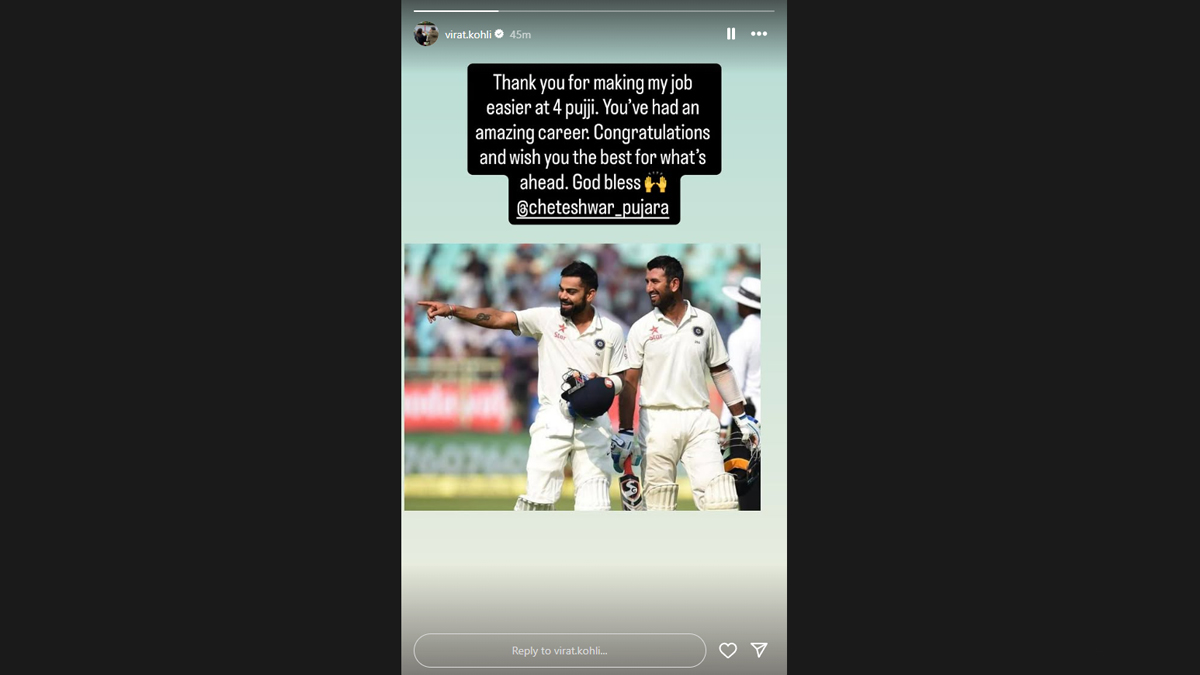 The legendary India national cricket team batter Virat Kohli has shared his feelings and left a heartfelt note on Instagram, following the retirement of Test stalwart Cheteshwar Pujara. The former Team India Test player and captain wrote, "Thank you for making my job easier at 4 Pujji. You have had an amazing career. Congratulations and wish you the best for what is ahead. God bless", with a pic of the two playing in White jerseys for the Men in Blue. "Pujji" is the nickname that teammates call Cheteshwar Pujara. Virat Kohli wrote that Cheteshwar Pujara, who used to bat at number three for Team India in Tests, made the job easier for him, who batted at four. Cheteshwar Pujara from all formats of the game on Sunday, August 24. Pujara has represented the nation in 103 Tests, scoring 7195 runs. He also played in five ODIs. Cheteshwar Pujara Retires: Virender Sehwag Says 'Grit, Determination, and Hardwork' Shown By Team India Test Stalwart Was 'Inspiring' (See Post).