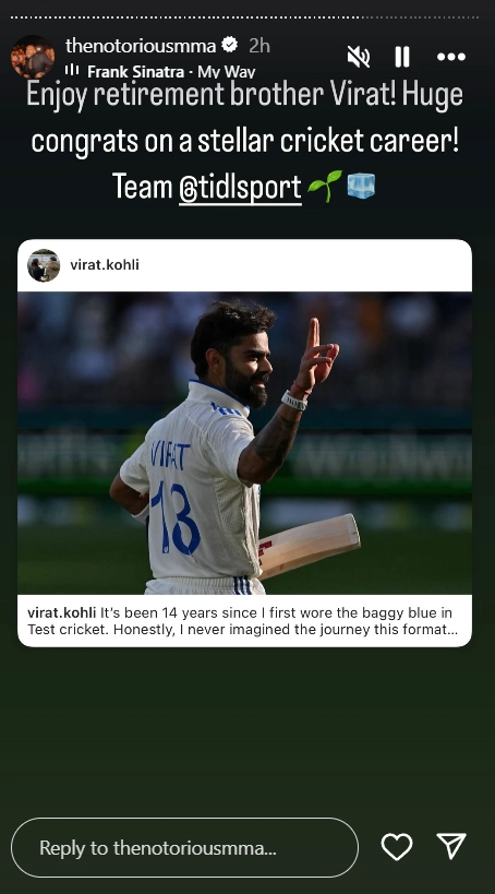 Virat Kohli announced his shocking retirement from Test cricket on May 12. Kohli's sudden retirement left the entire cricketing fraternity numb. Since then, many global icons and sports fraternities have poured wishes for the former Indian captain on his incredible 14-year Test career. Recently, UFC's biggest icon, Conor McGregor, has also chimed in on Kohli taking retirement from Tests. The UFC icon shared a story on his Instagram handle for the Indian legend and wrote, "Enjoy retirement brother Virat! Huge congrats on a stellar cricket career!".Ā When Will Virat Kohli Play Next for Indian Cricket Team After Star Cricketer Bids Farewell To Test Cricket?