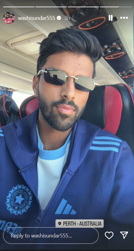Indian cricket team all-rounder Washington Sundar shared an Instagram story after he arrived in Perth ahead of the India vs Australia first Test in the Border-Gavaskar Trophy 2024-25. Notably, Washington Sundar travelled with the first batch of the Indian squad, who departed on Sunday night from Mumbai airport. The first batch included Mohammed Siraj, Shubman Gill, Yashasvi Jaiswal, assistant coach Abhishek Nayar, and many more. Star batter Virat Kohli has already departed for Australia with his family. The opening IND vs AUS Test will be hosted in Perth from November 22. Ravindra Jadeja Shares Update As India National Cricket Team Departs for Australia for IND vs AUS Border-Gavaskar Trophy 2024-25 (See Post).