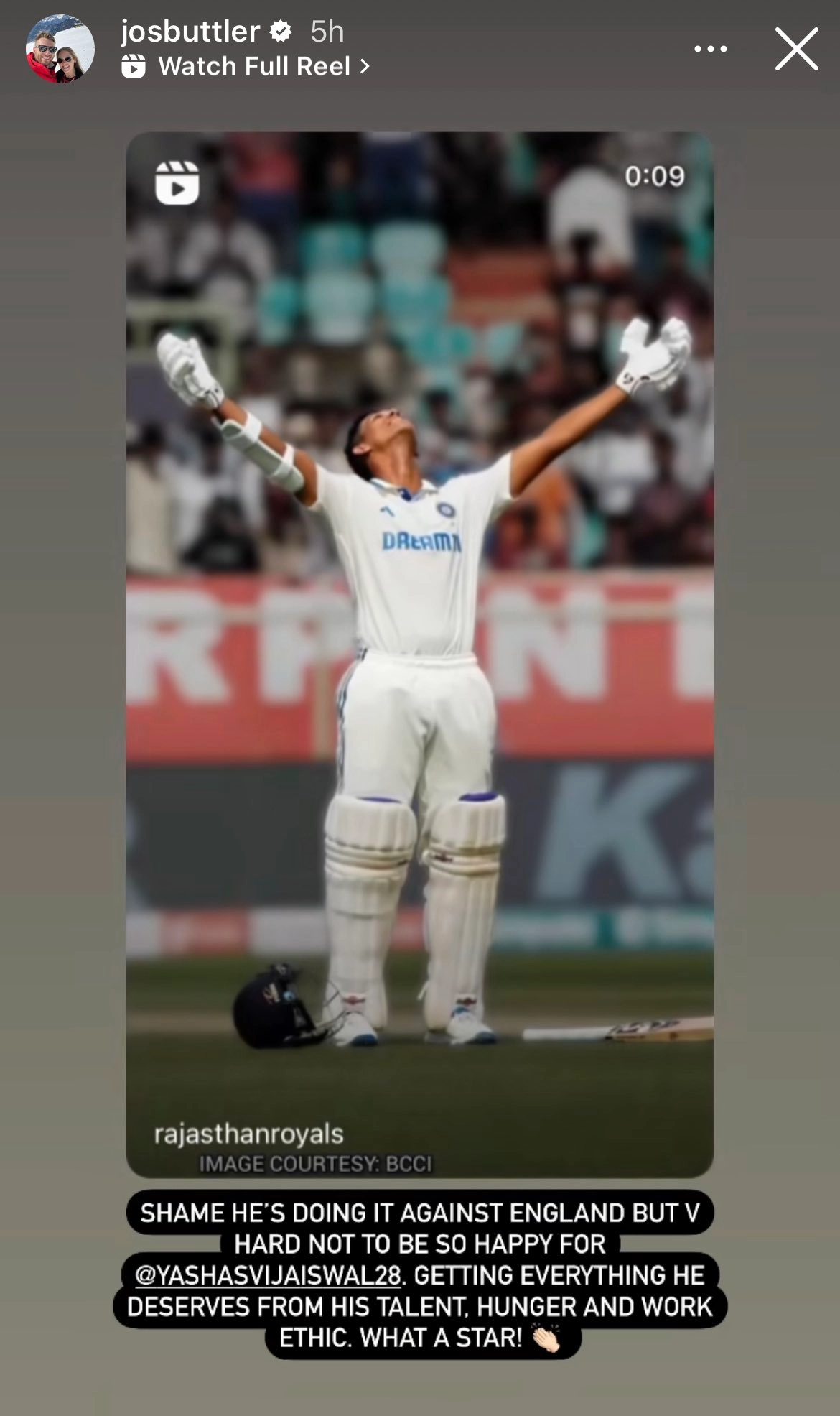 Yashasvi Jaiswal stunned the cricket world with his performance against England in the 3rd Test 2024 when he scored a scintillating double century powering India to a memorable victory. Even after he had to retire hurt on Day three, he returned with the same intent on Day four and went to hit James Anderson for three sixes in a row. Jos Buttler. Jaiswal's Rajasthan Royals teammate Jos Buttler, who was impressed by his performance shared an Instagram story lauding him. Buttler admitted that Jaiswal doing this against England is a 'Shame' but it was 'very hard not to be happy'. He also added that Jaiswal is getting everything he should be getting for his 'talent, hunger and work ethic'. Yashasvi Jaiswal Becomes First Indian to Score Two Double Centuries Against England in Test Cricket, Achieves Feat During IND vs ENG 3rd Test 2024.