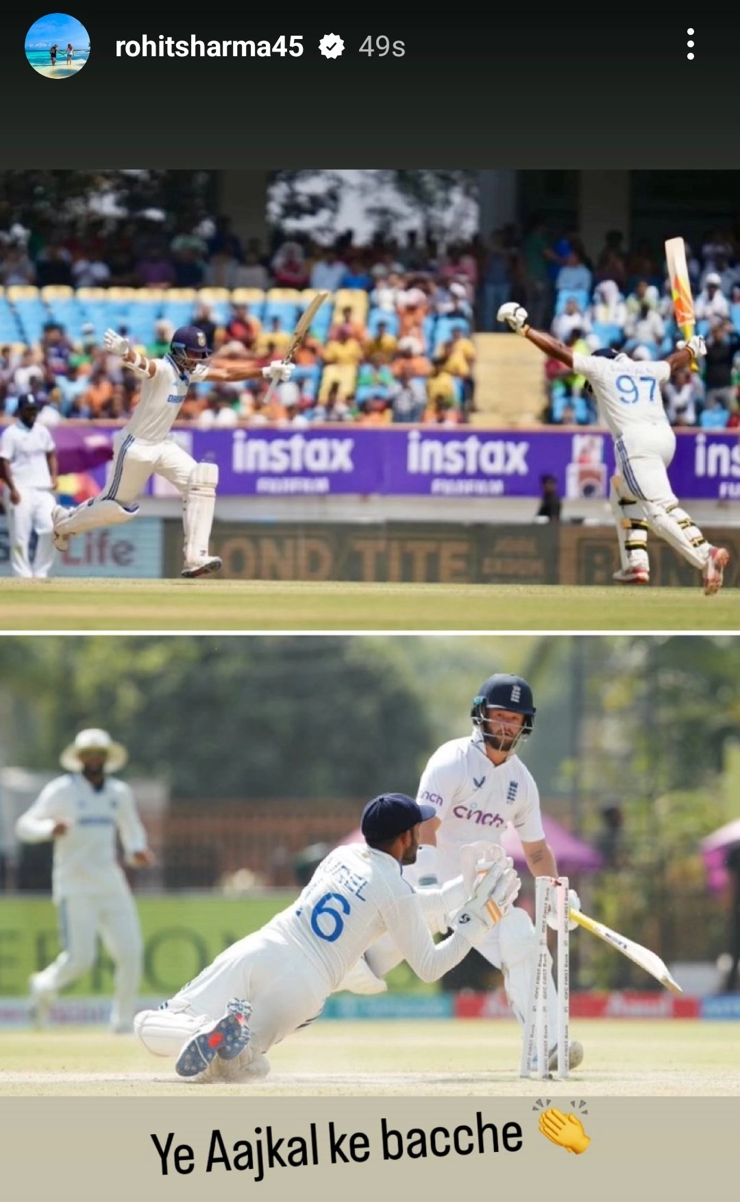 India fielding a playing XI with lot of new faces during the India vs England third Test 2024 at the Niranjan Shah Stadium in Rajkot. There were two debutants, Sarfaraz Khan and Dhruv Jurel along with the likes of Yashasvi Jaiswal who made his debut just six Test matches before. All of them shined in the third Test and a happy captain Rohit Sharma shared an Instagram story appreciating the youngsters of his team. His caption read 'Ye Aajkal Ke Bacche'. Fans loved his signature way of appreciating youngsters and made the story viral on social media. Ravindra Jadeja Dedicates Man of the Match Award to Wife Rivaba After Starring With Century, Fifer in India's Victory over England in 3rd Test 2024.