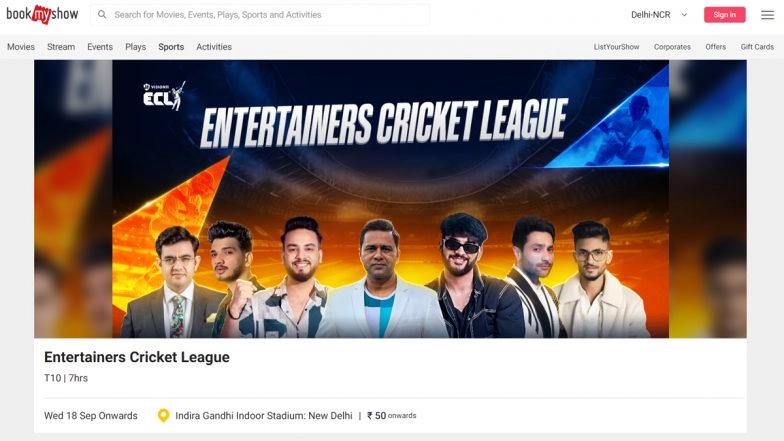 Tickets for the Entertainers Cricket League (ECL) 2024 start at INR 50 for matches held at Indira Gandhi Indoor Stadium in Delhi. These can be conveniently purchased via the BookMyShow app. The ECL 2024, which began on September 13 and runs until September 22, features an exciting T10 cricket tournament with popular social media stars and influencers. Over 10 days, six teams—Bangalore Bashers, Dynamic Delhi, Haryanvi Hunters, Lucknow Lions, Mumbai Disruptors, and Punjab Veers—are competing in a total of 19 matches. The event blends sports and entertainment, offering a thrilling experience for fans.. ECL T10 2024: Schedule, Teams, Captains, Live Streaming Online and All You Need To Know About Entertainers Cricket League.