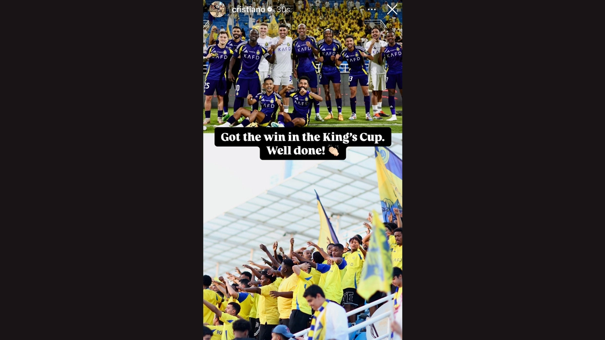 Cristiano Ronaldo was not part of the Al-Nassr squad during the clash against Al-Hazem in the King Cup of Champions 2024-25 match. Al-Nassr's Nawaf Boushal managed to score a last-minute equaliser which helped them secure a narrow win over Al-Hazem. With this win, Al-Nassr qualified for the King Cup of Champions 2024–25 round of 16 stage. CR7 took to his official Instagram handle and congratulated his Al-Nassr teammates after their narrow win. Ronaldo shared a picture of the team and wrote, "Got the win in the King's Cup, well done!" Al-Hazem 1-2 Al-Nassr, King Cup of Champions 2024-25: Sadio Mane, Nawaf Boushal Scores As Al-Alami Secure Narrow Victory.