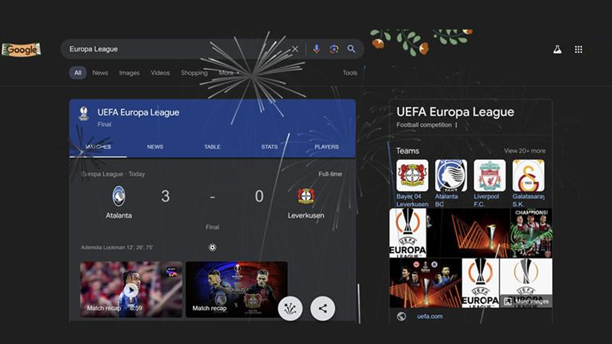 Google has their own way of celebrating Atalanta’s 3-0 UEFA Europa League 2023-24 final win over Bayer Leverkusen. Google came up with animated fireworks upon the search of Atalanta. Ademola Lookman came up with a fierce hat trick in the UEL 2023-24 final, leading his team to win. Bayer Leverkusen's undefeated run ended as Xabi Alonso and Co failed to take a proper fight against Atalanta. Even after keeping the majority of the possession of the ball to themselves, Bayer Leverkusen failed to turn the tide. Atalanta Wins UEFA Europa League 2023–24, Clinches Their First Ever Major European Title After 3–0 Win Over Bayer Leverkusen.