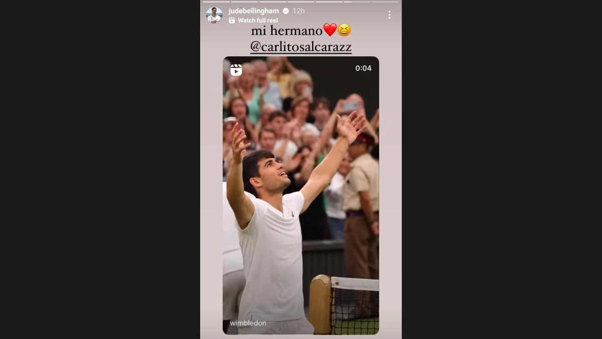 With multiple sports events ongoing at the moment, athletes get a chance to honour cross-sport stars of their liking. Playing at the Wimbledon 2024, Carlos Alcaraz did the same. The defending champion earned a hard-fought win over Frances Tiafoe in the third set. After a five-set thriller at the All-England Grass courts, Alcaraz honoured the win with the nation’s young football sensation Jude Bellingham, who is also shining at the UEFA Euro 2024 competition. After the star midfielder came across the video, he posted the same on his Instagram Story and showed love for the reigning French Open champion calling him ‘My Brother’. Jude Bellingham Handed One-Game Ban, Fined 30,000 Euros for Obscene Gesture Following England’s Last-16 Win Over Slovakia in UEFA Euro 2024.