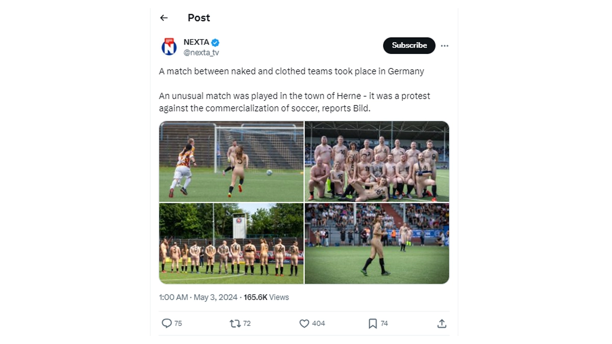 Sports have oftentimes been used to protest against something in a rather unusual example, a football. A football match was played between a team that wore clothes and a team that did not! To protest against the commercialisation of sport, the team named Pottoriginale All Stars competed against a side that wore clothes in a football match and played in Herne, a city in Germany, a BILD report states. Pictures of the match have gone viral wherein the players, who wore nothing but socks and boots, were seen having painted their jersey numbers on their backs and chests. The news and pictures of the match were shared in a post on 'X' by an account named "The NEXTA." Cristiano Ronaldo Scores Hat-Trick, Sadio Mane On Target As Al-Nassr Beat Al-Wehda 6-0 in Saudi Pro League 2023-24 (Watch Goal Video Highlights).