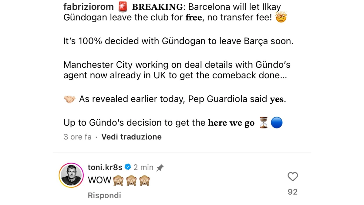 The ex-German and Real Madrid mid-field star Toni Kroos took to social media and reacted after an update on Ilkay Gundogan's transfer came online. Ilkay Gundogan is set to leave La Liga giants Barcelona. Gundogan joined Barcelona after winning the UEFA Champions League title with Manchester City in 2023. Barcelona will now let the mid-field star Gundogan leave on a free transfer. While reacting to this Toni Kroos responded to this update and commented, "Wow" under the social media post. Ilkay Gundogan announced his retirement from the Germany National Football Team and is now most likely to make a comeback to Man City after leaving Barca on a free transfer. Ilkay Gundogan Retires From International Football; German Footballer Confirms Euro 2024 As End of National Team Career.