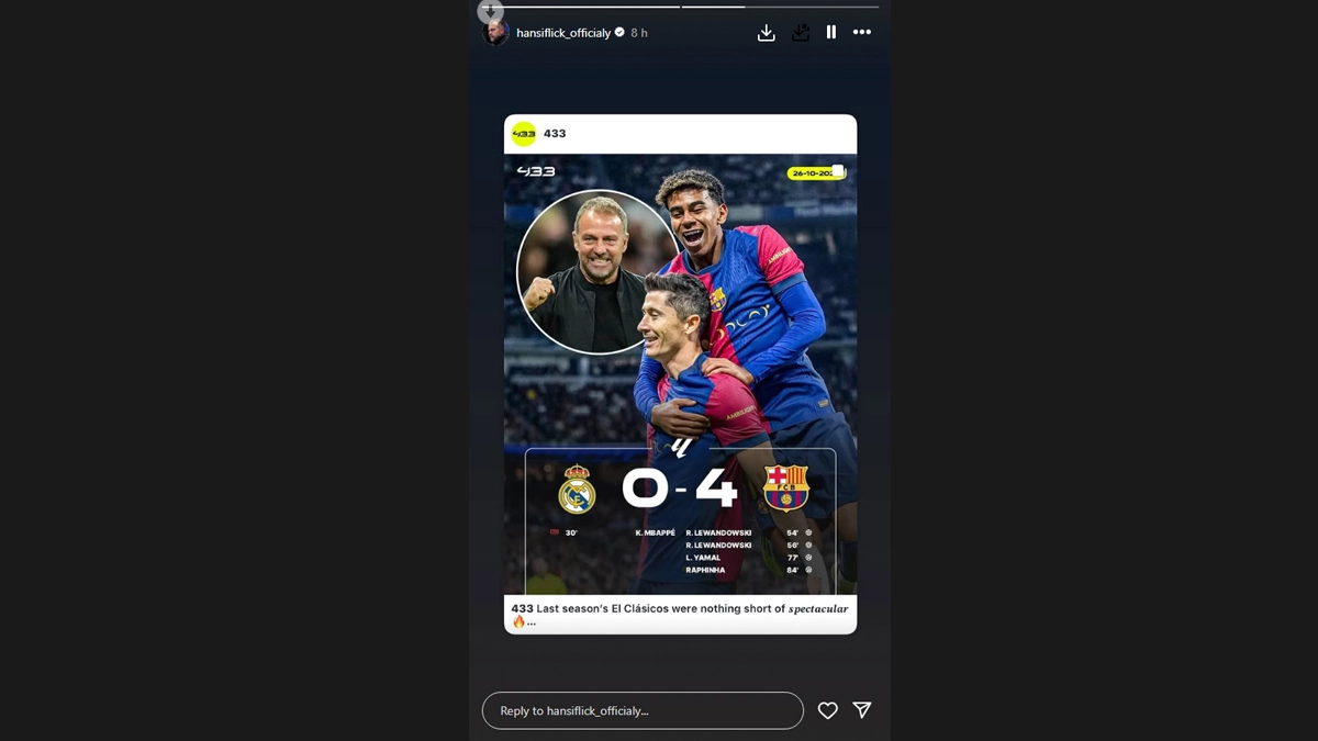 FC Barcelona head coach Hansi Flick took a dig at arch-rivals Real Madrid CF after the La Liga 2025-26 El Clasico at Santiago Bernabeu. The match ended 2-1, as Los Blancos clinched victory. Following the victory, there was chaos, and unpleasant exchange between players of both sides. Now, after the loss, Hansi Flick posted two stories on Instagram, in one he wrote, "Just specify which revenge you took". In the second story, he posted the match result of 0-4, where Barca had won, exactly a year before, on the same venue, on October 26, 2024. This was the first loss for the Cules in El Clasico since the arrival of Flick as coach. Hansi Flick, however, was not on the sidelines, but in the stands, as he was suspended after receiving a red card in a win against Girona. Real Madrid 2–1 Barcelona, La Liga 2025–26: Kylian Mbappe and Jude Bellingham Score as Los Blancos Win Drama-Filled El Clasico Thriller (Watch Goal Video Highlights).