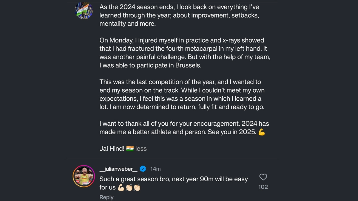 Germany's Julian Weber dropped a heartwarming reaction to Neeraj Chopra's post where he said that he could not meet his expectations. Neeraj Chopra came agonisingly short in the Brussels Diamond League 2024 final with Grenada's Anderson Peters taking the win. After the second-place finish which spelt the end of the season for Neeraj Chopra, the star javelin thrower took to social media to share his thoughts. The 26-year-old wrote that he could not meet his expectations in the 2024 season while also revealing a fracture he suffered before the Brussels Diamond League 2024 final. Weber, reacting to that post on Instagram, wrote, "Such a great season bro, next year 90m will be easy for us." Neeraj Chopra Reveals Suffering From Fracture in Left Hand Before Brussels Diamond League 2024 Final, Says 'Was Another Painful Challenge for Me' (See Post).