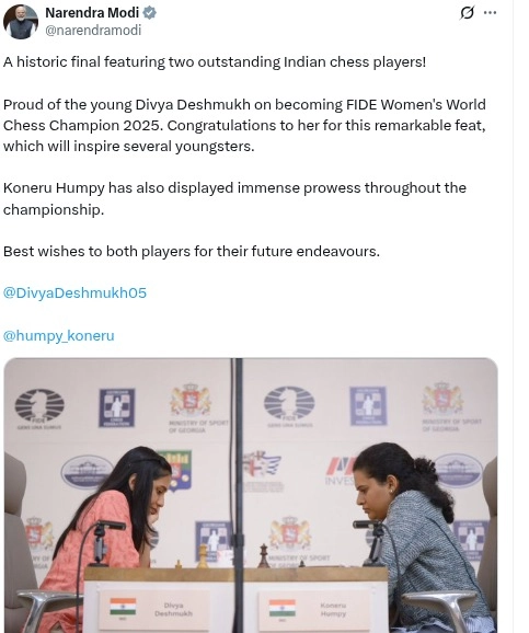 Divya Deshmukh scripted history when she became the first Indian woman to win a FIDE Chess World Cup in classical format. She achieved the feat by defeating Indian compatriot Koneru Humpy in the final. Despite the two classical games ending in a draw, Divya edged past Humpy in the tie-breaker. PM Narendra Modi congratulated Divya and shared best wishes for her and Humpy. But amid this, he addressed Divya as the FIDE Women's World Chess Champion 2025. Netizens spotted it as a mistake and pointed out that Divya is the FIDE Women's World Cup champion, not FIDE Women's World Chess Champion. One becomes the World Champion by winning the World Championship, not the World Cup. Female Grandmasters in India: Here's A List of Women Chess Players Who Attained the Highest Individual Title Awarded By FIDE.