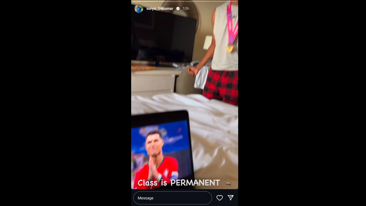 The India National Cricket Team is stuck in Barbados after their T20 World Cup triumph due to Hurricane Beryl. The Beryl situation is still in the minds of the fans, Suryakumar Yadav and Mohammed Siraj were enjoying the ‘off time’ as they were streaming the Portugal vs Slovenia UEFA Euro 2024 Round of 16 match. Cheering for Cristiano Ronaldo, Siraj even performed his ‘Suiiii’ celebration as CR7 scored a penalty in the match. Portugal won the match on Penalty shootout giving Surya and Siraj a chance to celebrate. They even mentioned ‘Class is Permanent’ for record breaking footballer Cristiano Ronaldo. Suryakumar Yadav also applauded Portuguese keeper Diogo Costa who won player of the match for three saves in the penalty shoot-out. Suryakumar Yadav Gives Funny Update on Hurricane Beryl at Barbados, Uses Movie Agnipath’s Dialogue ‘Hawa Tej Chalata Hai…’.